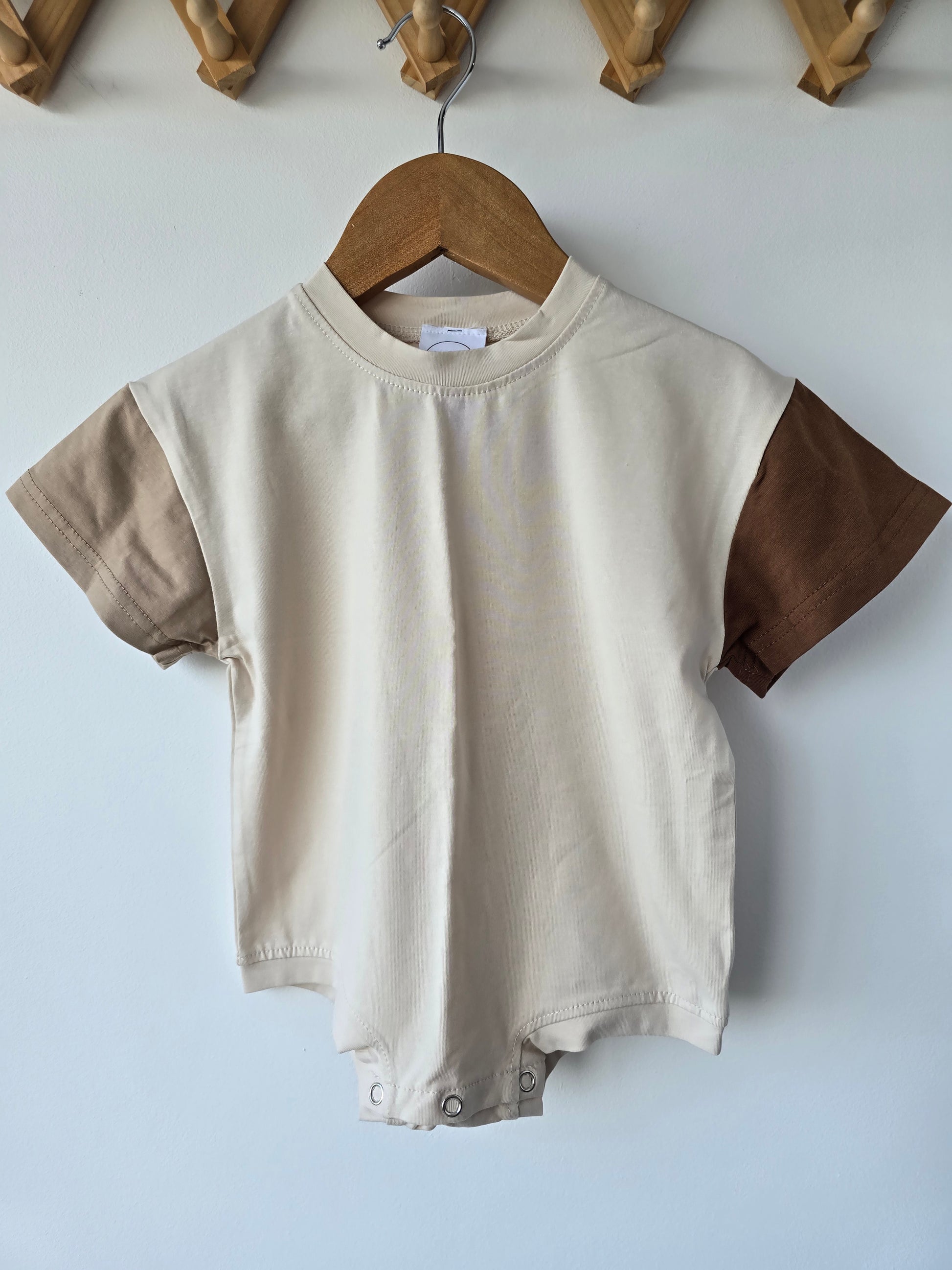 This colourblock romper in different shades of brown is perfect for every day. It is loose and comfortable to wear.
